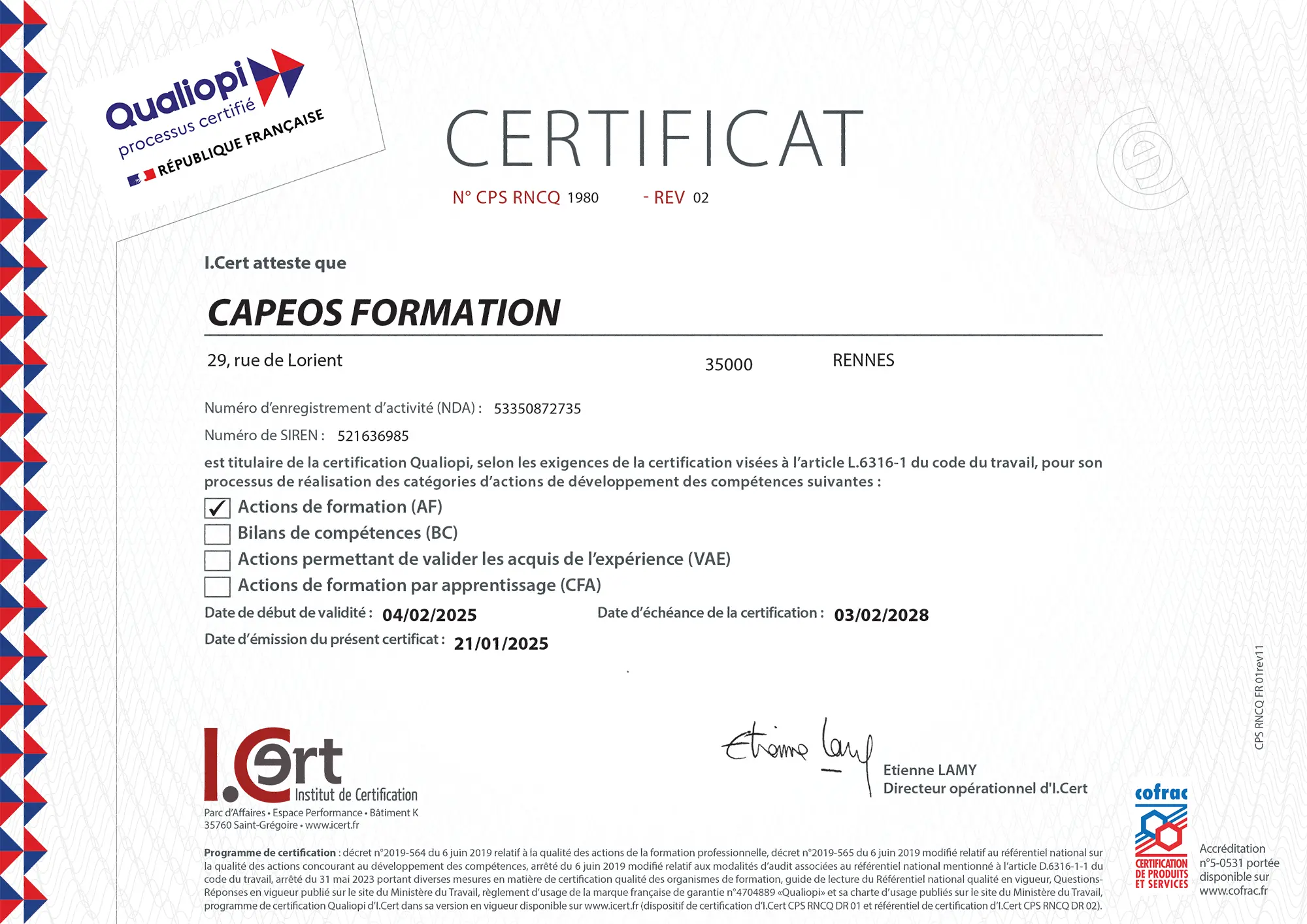Capeos a une certification qualité délivrée par l’organisme Qualiopi dans le cadre des actions de formation. La certification Qualiopi représente une reconnaissance cruciale pour les acteurs de la formation, consolidant la crédibilité et la qualité de leurs services dans un environnement professionnel en constante évolution. Pour attester de cette crédibilité, Capeos Formation passe des audits réguliers avec Qualiopi afin d’être évalué selon des normes strictes pour attester de la qualité des formations.
